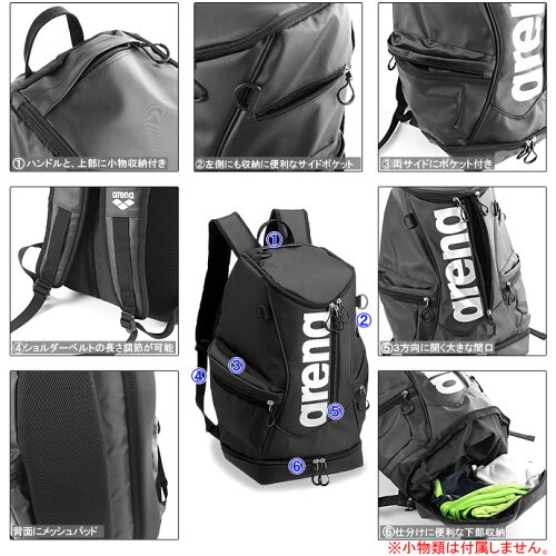 アリーナのバックパック! ●水や汚れに強いタフな素材を採用した、大容量のリュックが登場! ●3方向のファスナーで大きく開く間口を確保、荷物の出し入れが楽に出来ます。